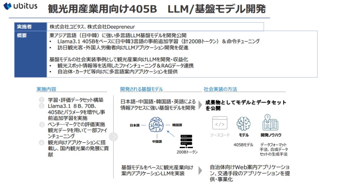 Ubitus K.K. (hereafter Ubitus), a leading cloud streaming provider, was selected on October 10, 2024, for Japan’s Ministry of Economy, Trade, and Industry (METI) and New Energy and Industrial Technology Development Organization (NEDO) GENIAC Program. This program aims to enhance “Post-5G Information and Communication System Infrastructure R&D Project / Post-5G Information and Communication System Development.” Through this initiative, Ubitus will develop a 405B AI large language model (LLM) optimized for tourism and cultural content, which will be made open source.